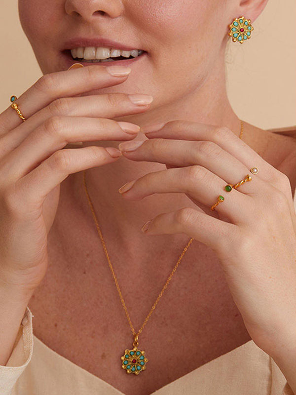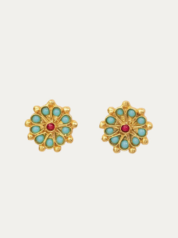 Made by hand by the local artisans in the Istanbul workshop, this bestselling piece by Ottoman Hands showcases a delicate floral design adorned by bright turquoise and red agate beads. Light and easy to wear, these petite stud earrings are perfect for adding artisanal charm to your looks.