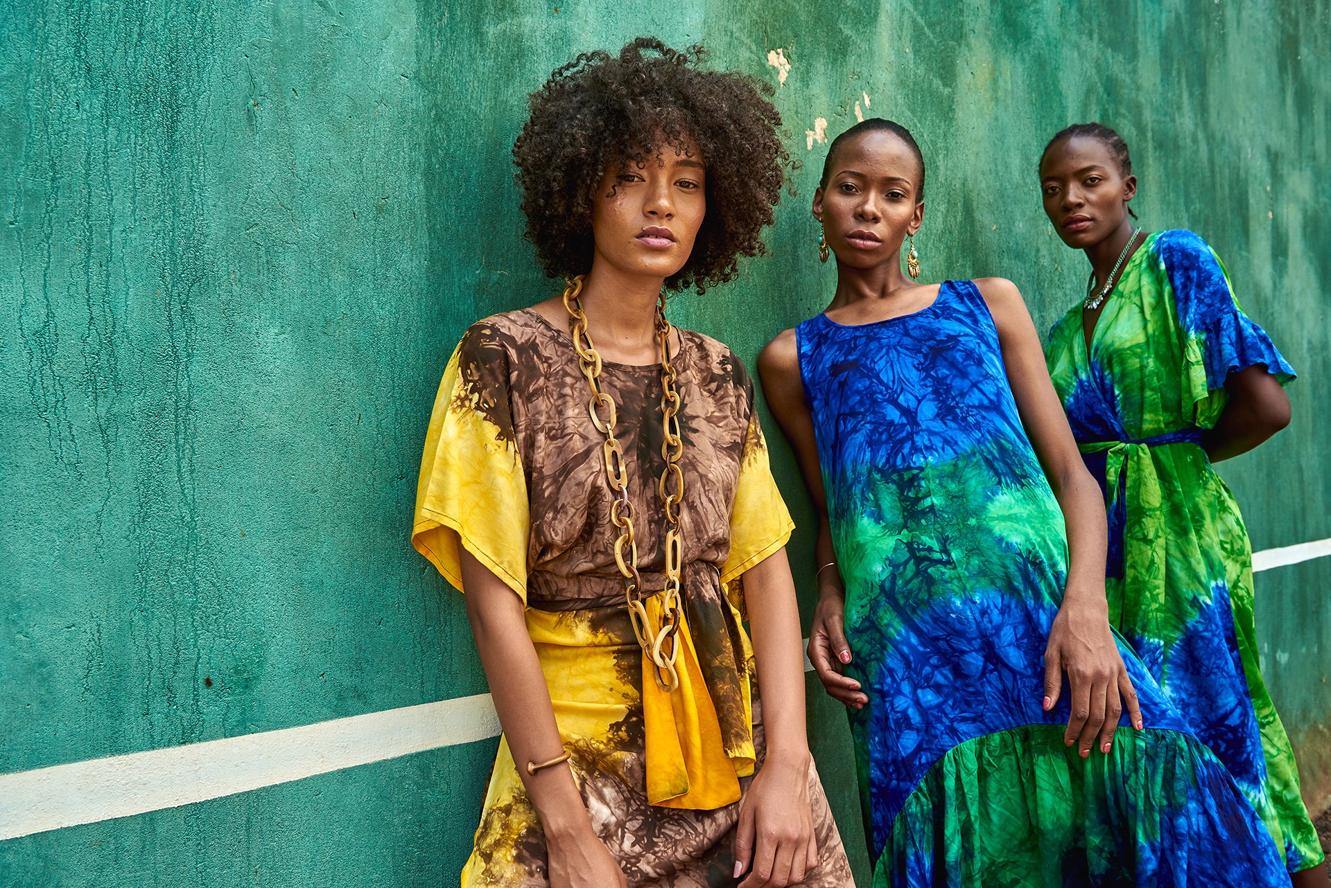 The beads on the dress are made from recycled glass by members of the Krobo tribe in Ghana, by using a centuries old technique. The crushed glass is shaped is heated over a fire in moulds which are made from mud. That gives the beads their frosty and uneven texture. The colour of the beads on your dress is determined by the type of glass that is used and will vary between white, blue and green.
