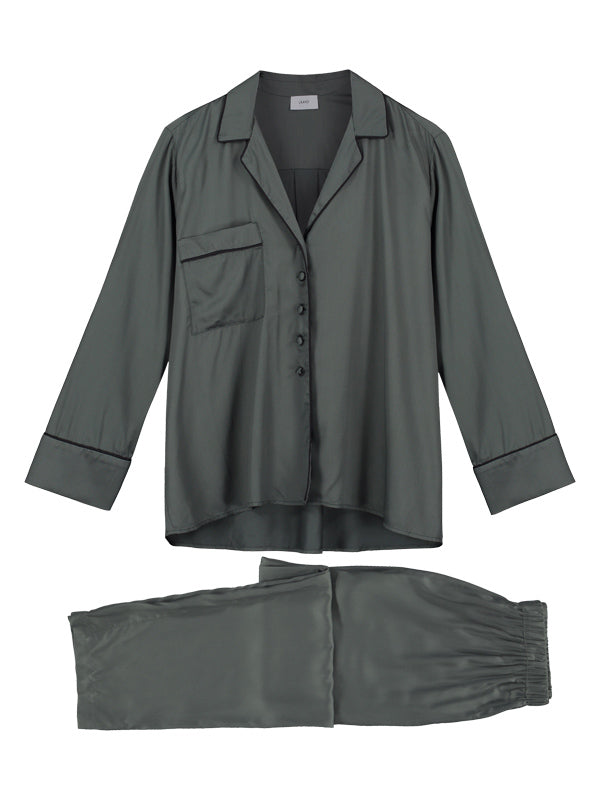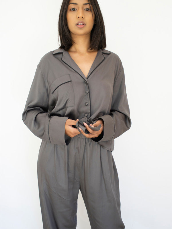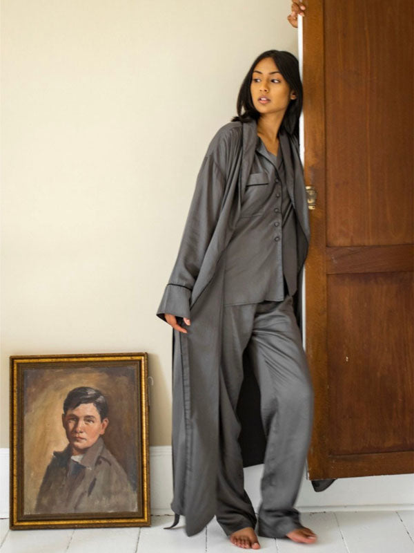 Luxurious silk pyjama set in a sophisticated grey. Tailored from soft bamboo silk, the loungewear is classic in style, with a slightly oversized top and elasticated waistband for comfort. Slim piping detail add to the sophistication, whilst a front chest pocket (top) and two side pockets (bottoms) add functionality. Wear with the designer’s matching silk robe to complete the look.