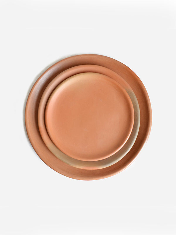 The unusual firing technique used to make these terracotta plates result in a spectrum of colours that range from beige to peach and soft grey. Handmade in Oaxaca, Mexico, the local clay is soaked for 20 days to remove impurities before being soaked and burnished with a quartz crystal. The dinner plates are then wood fired underground and oxidised, leaving the pieces with their varied colours.