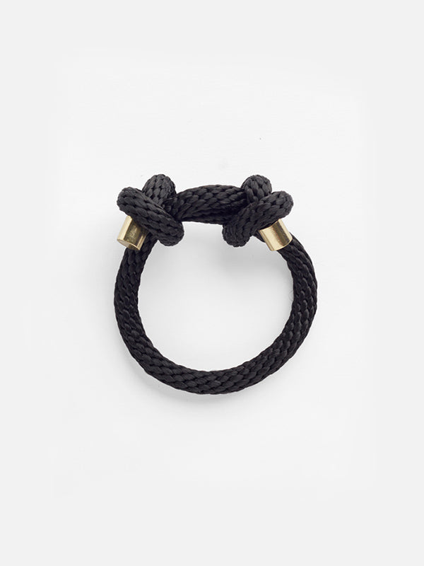 Black coloured braided rope bracelet finished with brass caps. The knot bracelet is made by hand in Cape Town using repurposed rope.