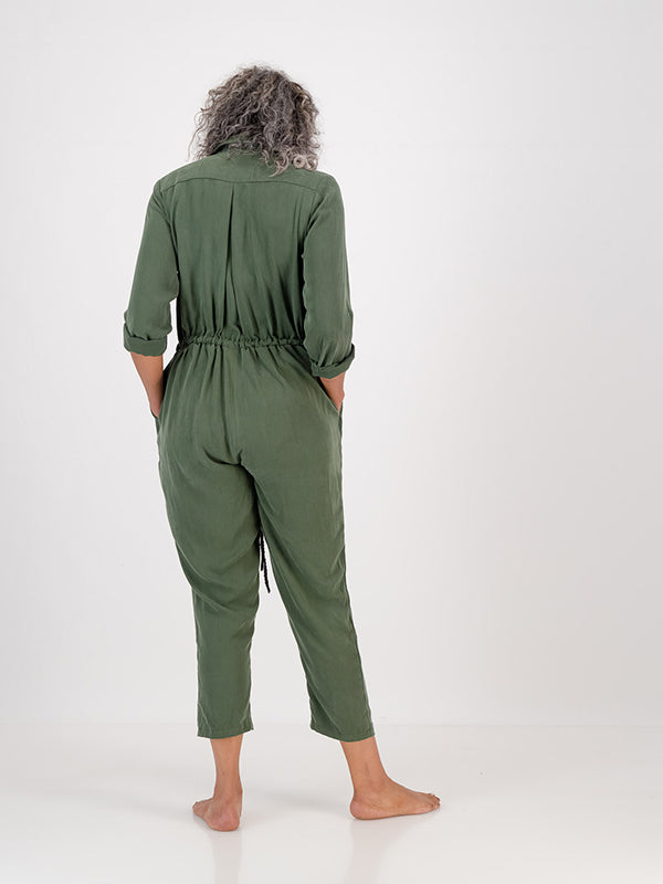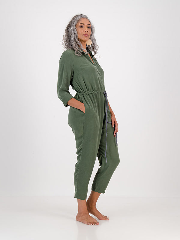 Combining sustainability and comfort this olive green jumpsuit made from Tencel™, a super soft fibre made from dissolving wood pulp, is the definition for cozy and chic. It is designed to be comfortable and flattering all in one with a belted waist, stand up collar and long sleeves. Full length, loose fitting trousers finish off this look. This piece is perfect for days where you want comfort, warmth and elegance with no fuss!