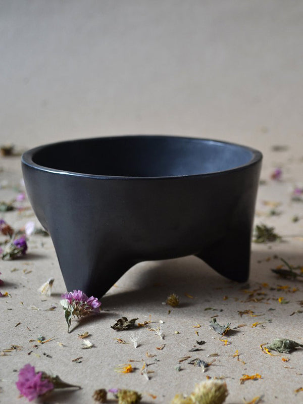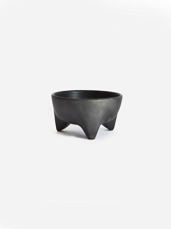 Tzinacan means bat in Nahuatl, an indigenous Mexican language. Bats were of great importance in pre-hispanic Mexico mythology, symbolising different aspects in each culture, from darkness and earth to corn and fertility. Handmade in Oaxaca, this unique black footed bowl is made using a local traditional artisanal technique called barro negro. First the clay is soaked for 20 days to purify. Once shaped, it is smoked to achieve its black colour and burnished, rather than glazed, by polishing the surface with a quartz crystal. To finish, the small footed bowls are wood-fired in underground pits or kilns, emerging with their signature dark colour and warm glossy glow. Use to keep keys and trinkets, or as a thoughtful gift to a friend.