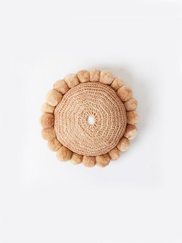 The Valle Pom Pom cushion is unique in its design and is handwoven on a circular loom. Its name Valle translates as Valley, and is inspired by the location where the artisans that make it come from. Designed and made in Argentina, the round wool cushions are available in rose pink, natural, brown, light grey and black.