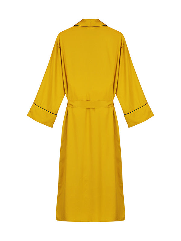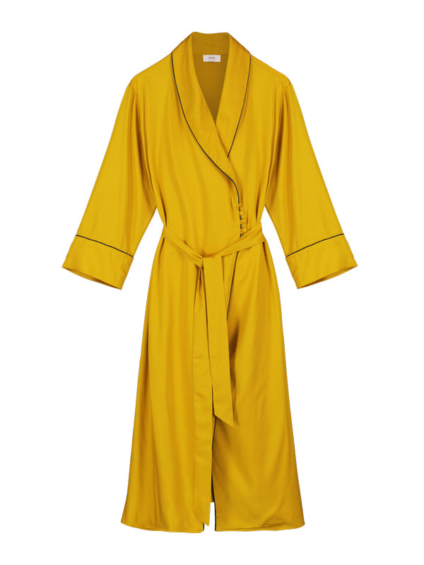 Bold and playful bamboo silk robe. Full length with slim piping details and two pockets. A loose belt and loop hole fabric buttons at the waist allow you to wrap the robe securely and comfortably. Made by artisans using luxuriously soft organic bamboo silk. Complete the look with the designers matching bamboo silk pyjama set.