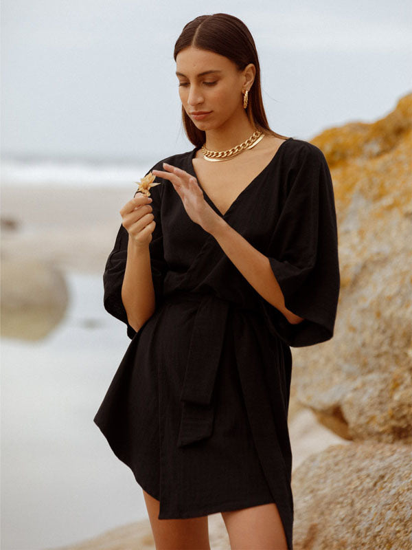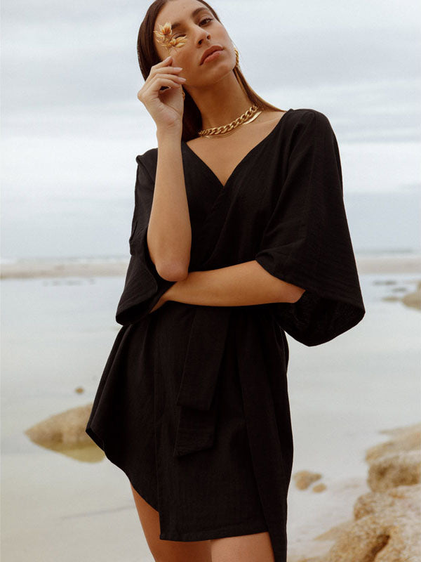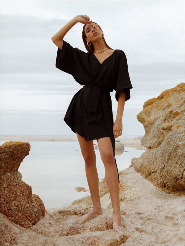 This cotton wrap dress by Museā is perfect for throwing on in the warmer months. Made by artisans in Cape Town, the dress is cut from 100% cotton in black. The gown-style dress wraps has a flattering wrap silhouette that ties at the waist and can be adjusted to you. Kimono sleeves add a touch of elegance. Style yours with chunky boots or delicate sandals depending on where you are heading.