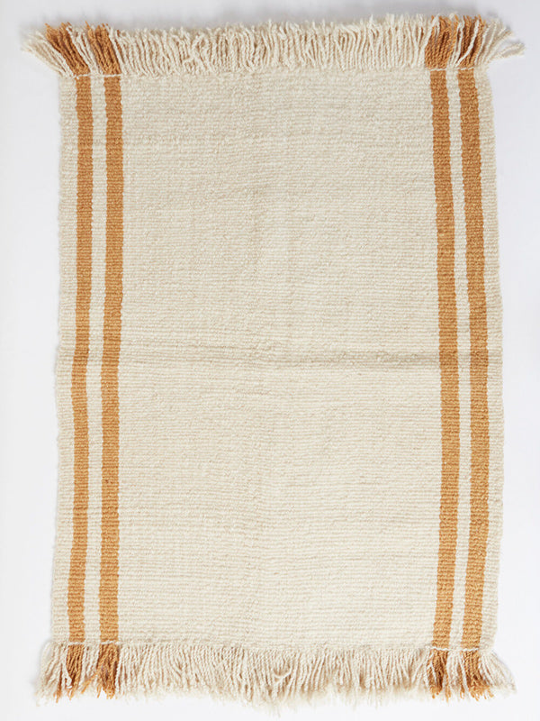 The Lago Rosario rug has been designed and made in Patagonia, Argentina, by an indigenous community, Mapuches, that live near Lago Rosario. Made from Merino sheep's wool, the small fringed rug has an off-white base with two mustard strips running parallel to the side of the rug. Its size makes it an excellent accent piece that can be used in the bedroom, at an entrance, and by the kitchen or bathroom sink.