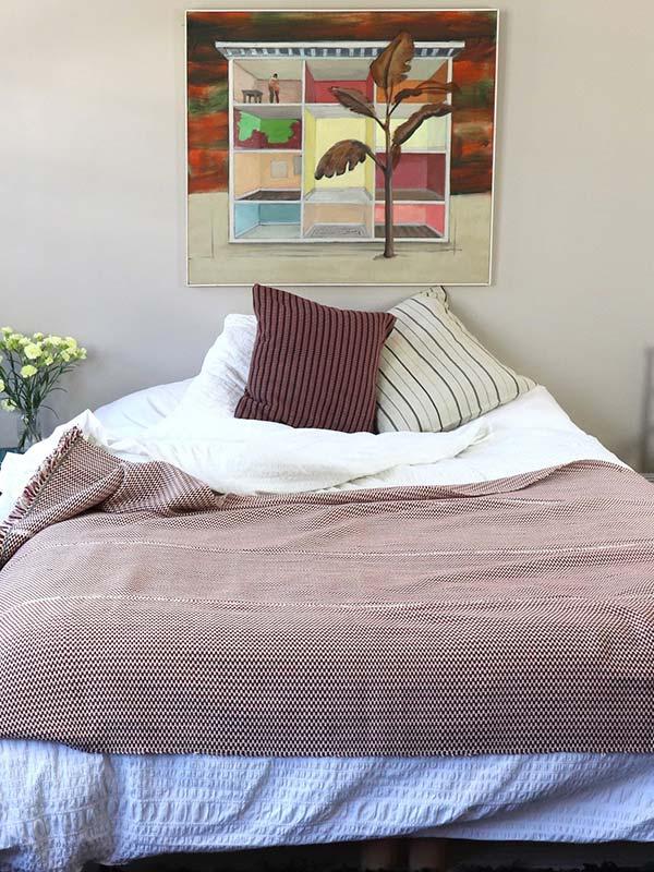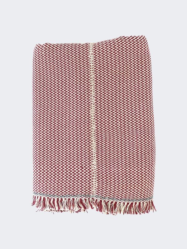 A luxuriously thick and weighty cotton blanket that’s soft to touch and snuggle underneath. Made in Ghana, the 100% cotton blanket's neutral hues make it perfect for adding a layered, textured look to your bed or sofa in your home. The wine red and cream patchwork pattern is based on the plumage of the Guinea Fowl, one of the original traditional patterns of the Dagaare people of north Ghana. Handwoven by women weavers using traditional techniques. Once woven the blanket is meticulously hand sewn with rows of cross stitches by seamstresses.