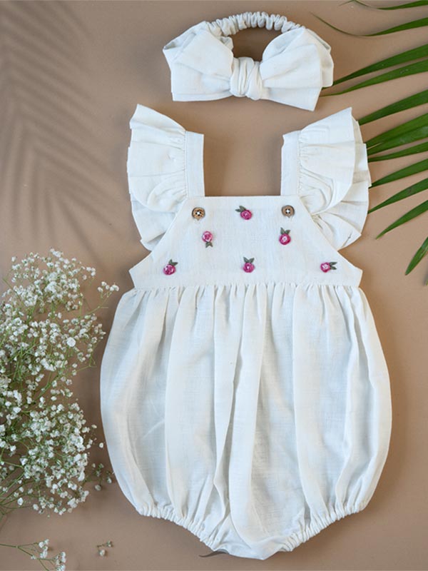 Baby Romper: a unisex baby girl romper made from soft organic cotton making it gentle on babies' skin. The tiny-teeny florals add elegance and are hand embroidered by woman artisans. The shoulder strings ensure the length can be adjusted as the little one grows. The crotch button closure ensures fuss-free diaper changing.