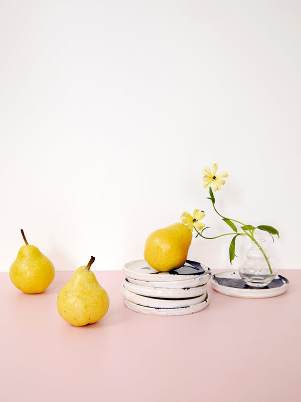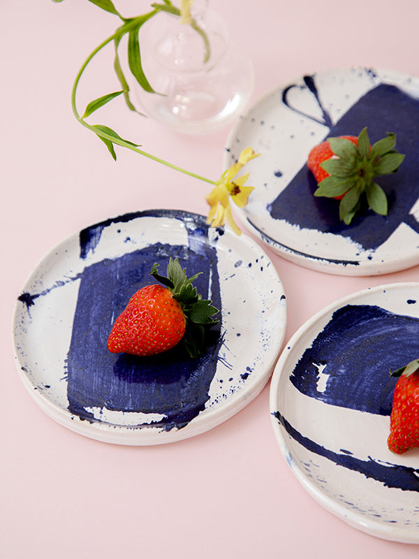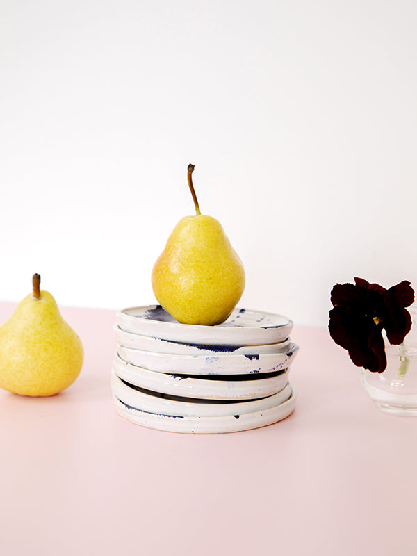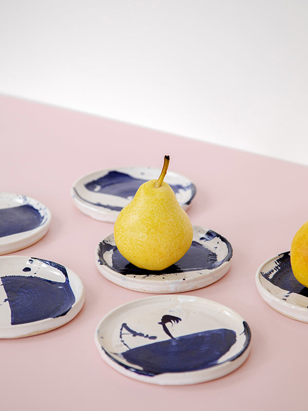 Beautiful and versatile, this ceramic side plate can be used as both a side plate or trinket dish. Handmade by Tessa Rudnick in her Herzliya studio in Israel, the small plate is crafted from earthenware and finished with a white glaze and cobalt oxide to achieve the beautiful splash design. Pair with other pieces from the collection, including these serving platters and bowls.