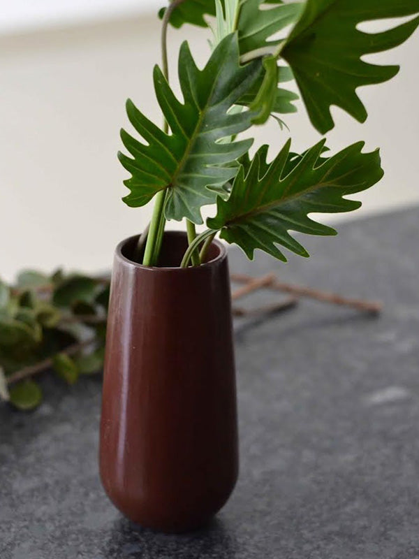 The Eren vase is a decorative vase characterised by its deep wine hue and smooth finish. Crafted by artisans in Mexico, the flower vase is made from ceramic and finished with pure beeswax. The vase has a long sculptural form with a rounded base. Perch yours on a mantelpiece, with or without flowers.