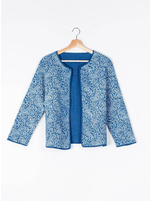 The Quilted Reversible Jacket is the best all around jacket handmade from eco-cotton and handprinted with indigo dye in a pretty blue and white floral print. Great as a statement jacket – you won’t go unnoticed. Use it for going out and dressing up as well as at home and throwing over a t-shirt.