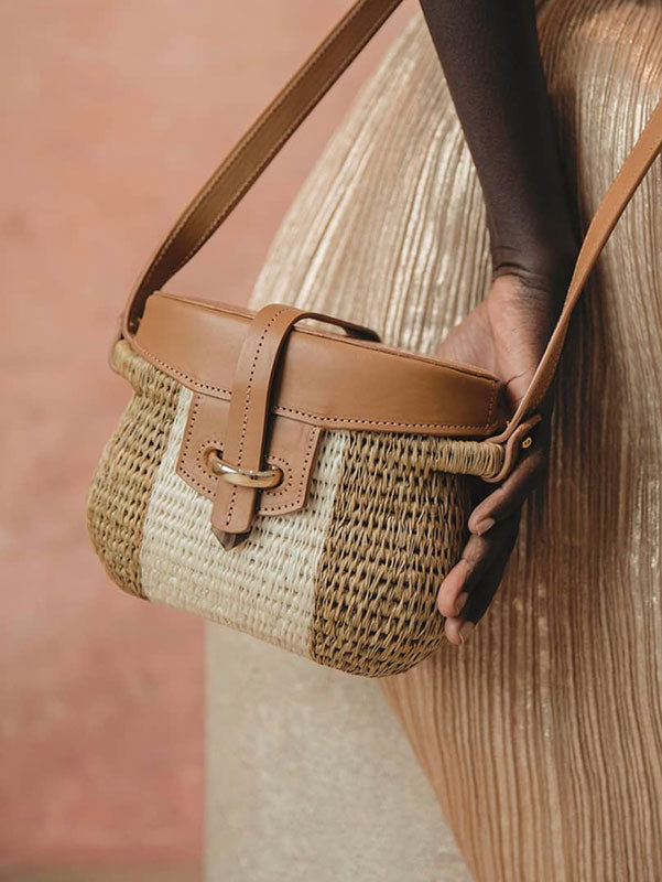 The Jabu Basket Bag in natural sandstone is sturdy, versatile and timeless. Handwoven in Eswatini, this woven basket bag is made from lutindzi grass – indigenous to Eswatini – and locally grown sisal fibre. The bag features an ecru leather lid, silver tone hardware and hand carved cow horn details. Perfect for weddings, travelling, or a practical everyday bag.