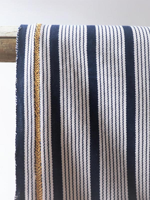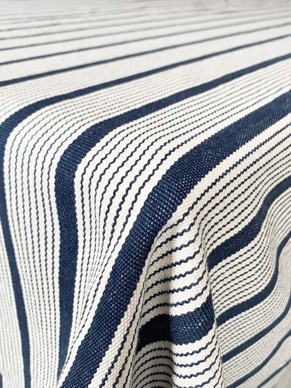 Boon & Up's striped tablecloth in dark blue is handwoven using traditional looms in Ghana. Made from locally grown cotton, the 100% cotton tablecloth features dark blue and off-white stripes decorated with three lines of cross stitches, following a traditional Dagaare pattern.