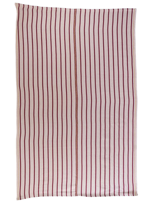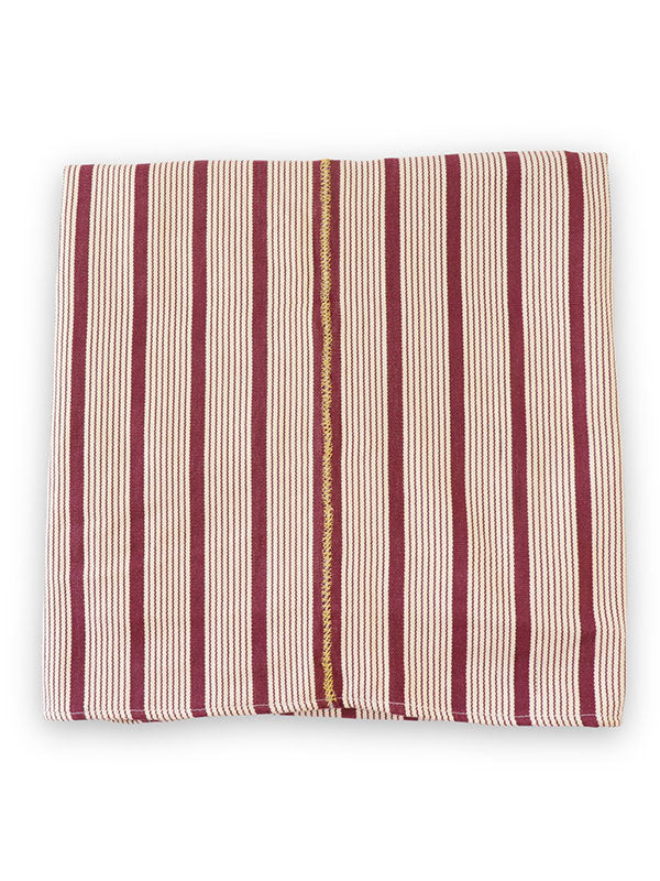 Boon & Up's striped tablecloth in wine is handwoven using traditional looms in Ghana. Made from locally grown cotton, the 100% cotton tablecloth features red and off-white stripes decorated with three lines of cross stitches, following a traditional Dagaare pattern.