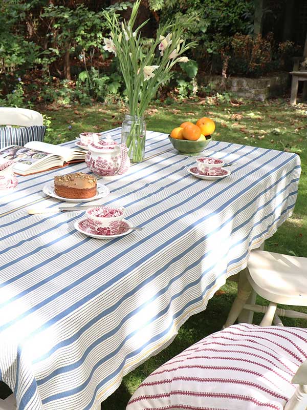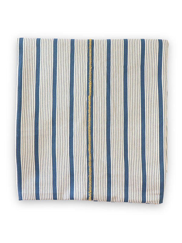 Boon & Up's striped tablecloth in sky blue is handwoven using traditional looms in Ghana. Made from locally grown cotton, the 100% cotton tablecloth features sky blue and off-white stripes decorated with three lines of cross stitches, following a traditional Dagaare pattern.