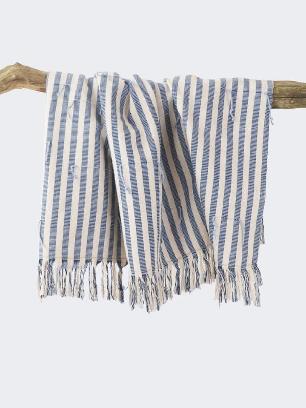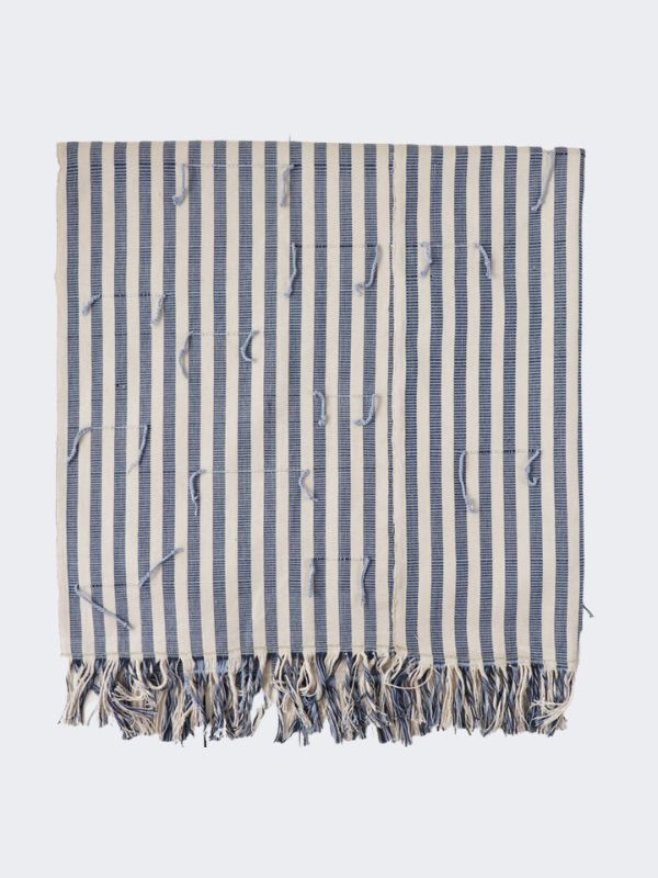 A striped cotton throw using a traditional Dagaare pattern. The blue striped cotton throw is scattered with tags of crocheted cotton across the fabric that add an extra unexpected dimension to the pattern. The "imperfections" across the throw creates a timeworn texture and an instant ‘heirloom’.