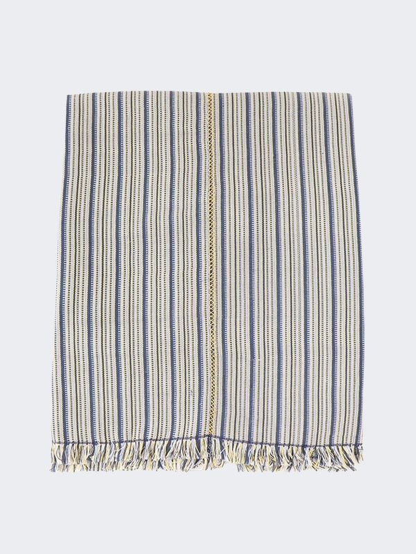 This striped blue and yellow throw adds a depth to any look, indoors or outside. The pure cotton throw is handwoven in Ghana using robust traditional hand looms to create a patina of "imperfections" across this throw that creates a timeworn texture and an instant ‘heirloom’. The throw is set off by a yellow stitching that runs up and down the length of the fabric.