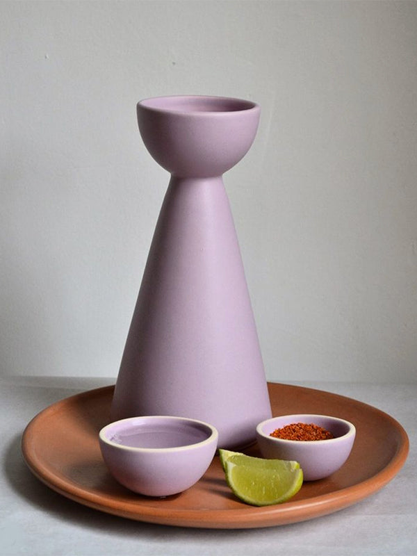 The Half Moon Carafe is designed to hold Mezcal, Tequila or any other liquor. Made in Mexico, the decanters take inspiration from the traditional water pitchers found in Tonalá and Tlaquepaque, Jalisco. Its cone-shaped body is a nod to the shape of agave leaves while the upper part takes the shape of a traditional mezcal cup. The head of the bottle contains two cups that can be used to serve the liquor or hold salt. The jug is finished in a lilac glaze, both inside and out. The carafes make a fantastic gift to any tequila lover.