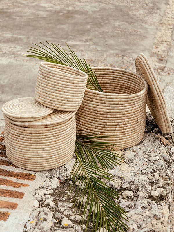 The all-natural fique baskets add texture and character whilst serving as practical neutral accent pieces and storage options throughout the home. H andmade by an artisan cooperative in the town of Guacamayas, Boyacá, Colombia, the storage baskets come in 3 sizes for easy multi-purpose use. Group the lidded baskets as a nesting set, or separately for the space of your choice.