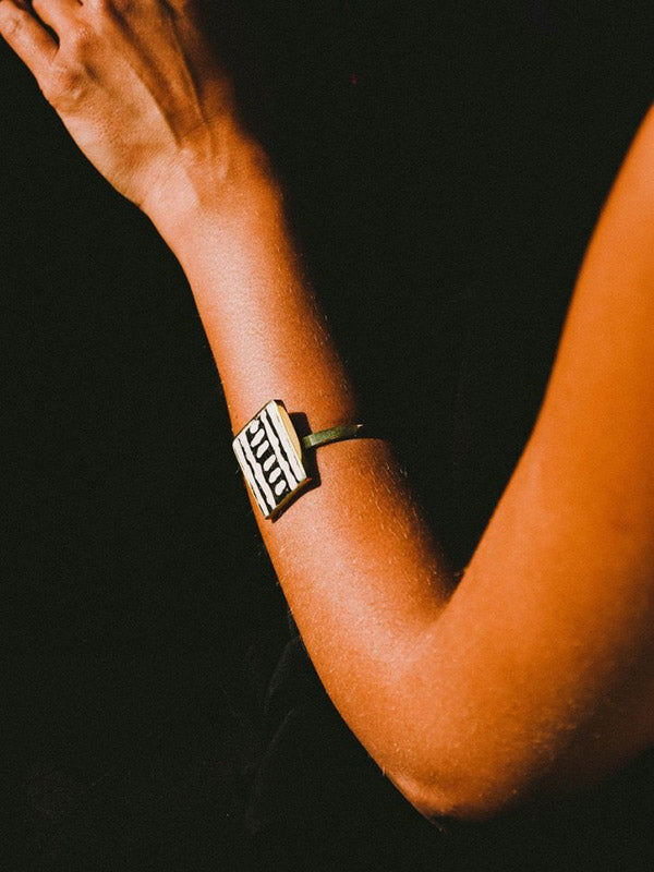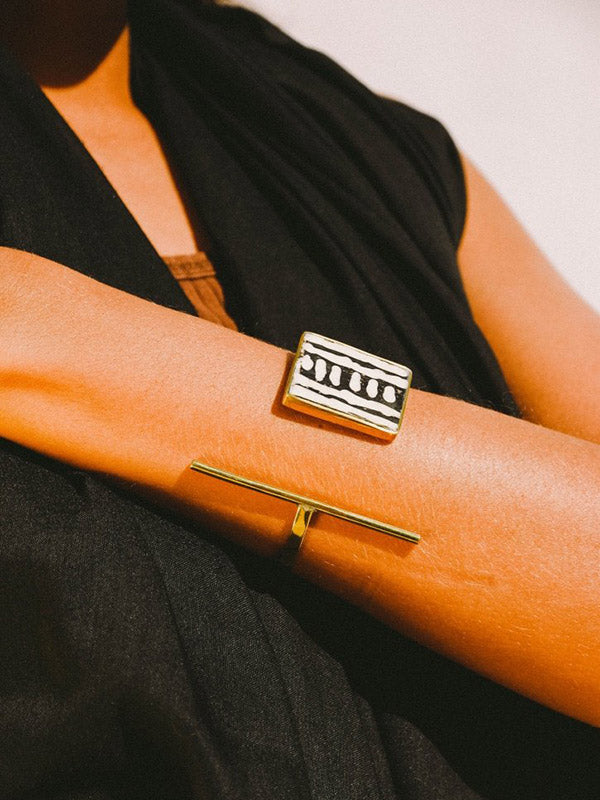 The Mraba Cuff has been hand-crafted by expert artisans in Kenya using traditional crafting and polishing techniques. The wide gold cuff bracelet is made from 100% recycled brass that matches a yellow gold in colour but is a sustainable alternative to gold.