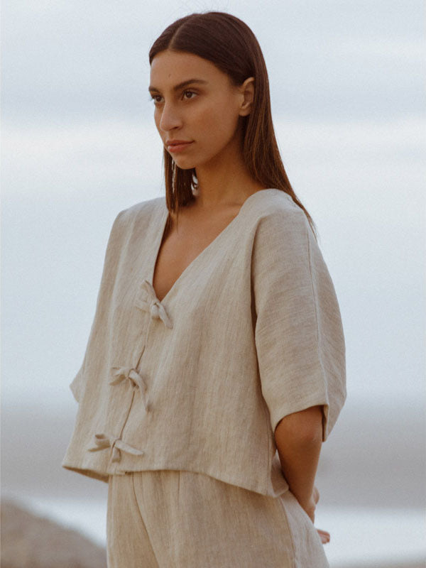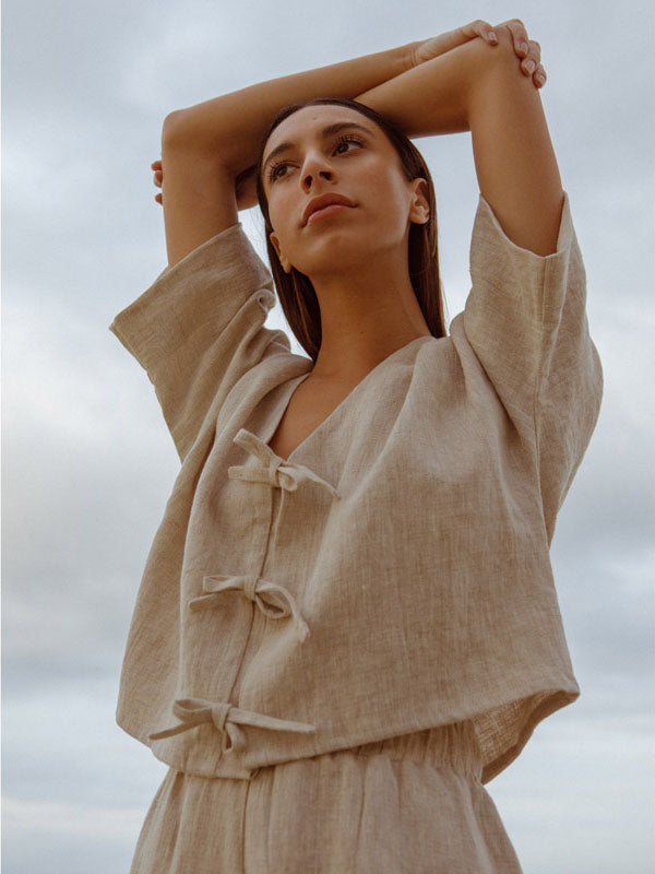 Museā’s tie-front linen top has an airy and breathable quality that makes it ideal for summer months. The top is cut from pure lightweight linen and has a cropped fit with subtle kimono sleeves. It has a low neckline and fastens at the front with three bow ties. Pair yours with the designer’s coordinating linen shorts and mules.