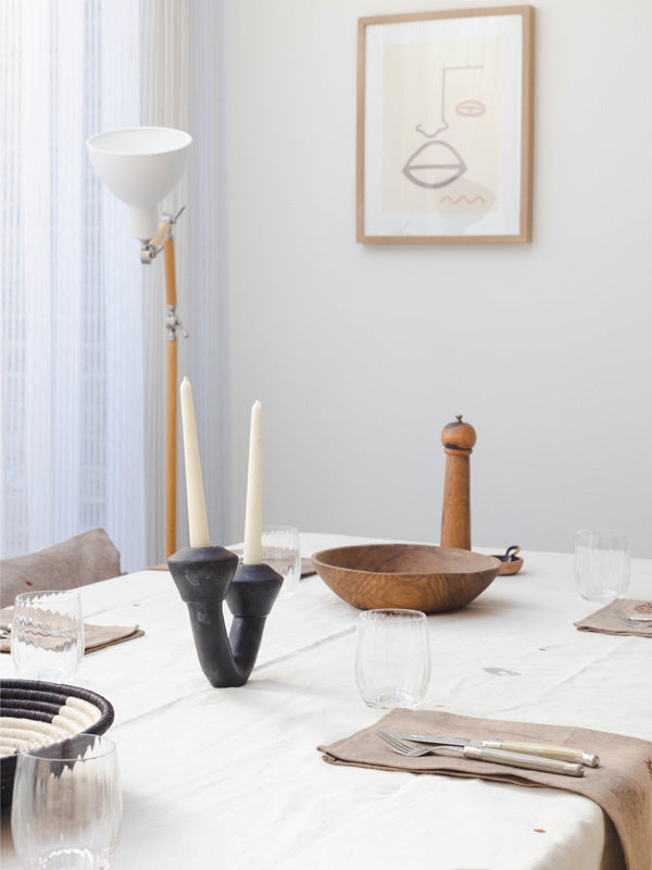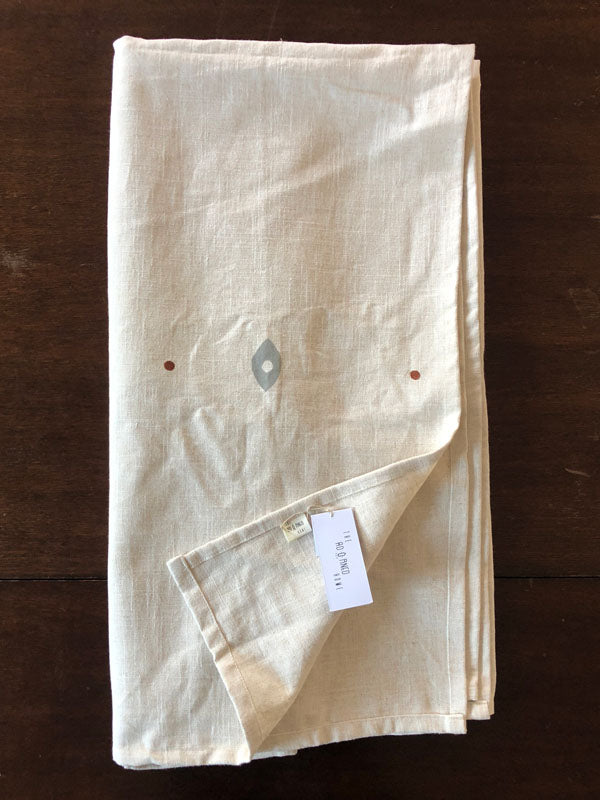 This naturally dyed linen tablecloth is one of a kind, lovingly hand dyed by Nastasha Sale, founder of The Adorned Home. Using sustainable and traditional textile methods, the cloth has been hand dyed using pigments extracted from organic plant waste. The design features a “third eye” print in soft grey and deep earthy red. Made from natural linen, this tablecloth will add a warm earthy touch to your dining arrangement. Pair with napkins from the designer’s collection to complete the look.