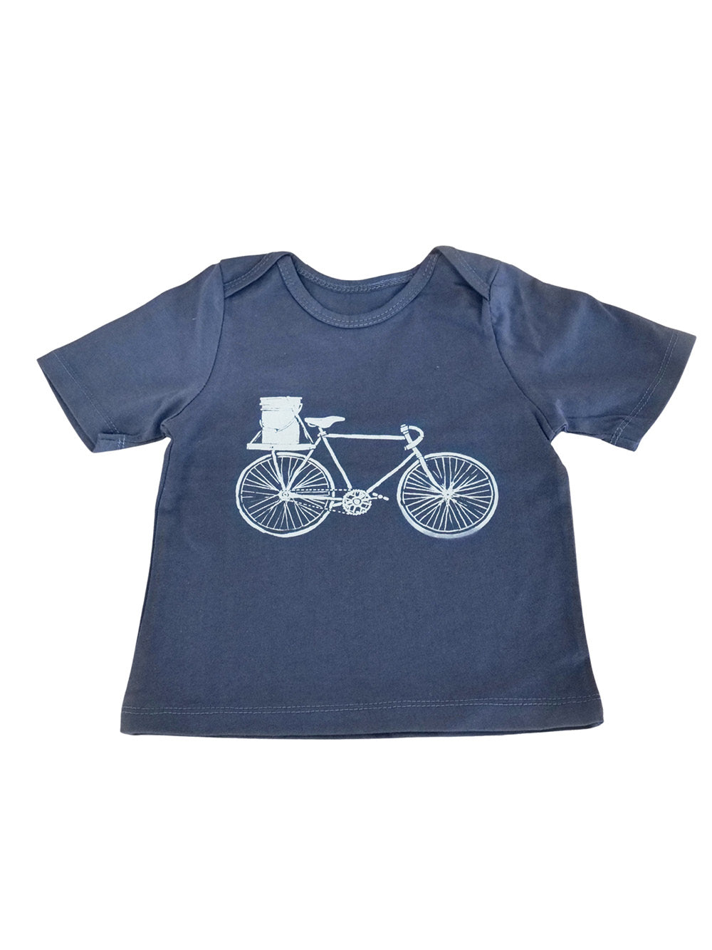 A gorgeous navy t-shirt featuring a playful bicycle print. The organic baby t-shirts are made using 100% certified organic cotton, a non-toxic fibre that is soft and gentle on babies skin. The t-shirts are unisex and available in two sizes.