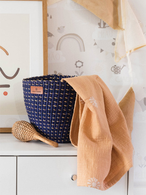 A gorgeous double cotton muslin baby blanket perfect for bedtime, story time and cuddle time. The baby throw has been naturally dyed using pigment extracted from avocados pips to create an organic pinky pecan hue. The sunshine print in white has been hand printed using a lino-block stamp carved by the brand’s founder. Made from 100% cotton muslin, the lightwieght throw is a wonderful addition to any pram, nursery or crib.
