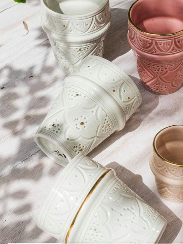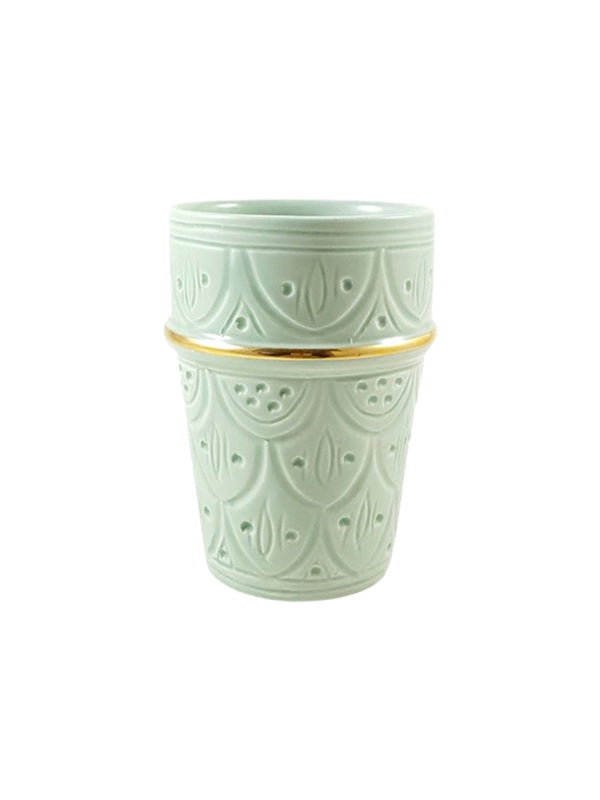 Handmade by artisans in Marrakech, these pistachio green ceramic cups are embossed in a classical Moroccan ceramic zwak design and finished off with 12-carat gold rim for a touch of elegance. Not only are these cups great for tea or coffee but can also be used decoratively around the house as a miniature vase with fresh flowers. Come as a set of 2.