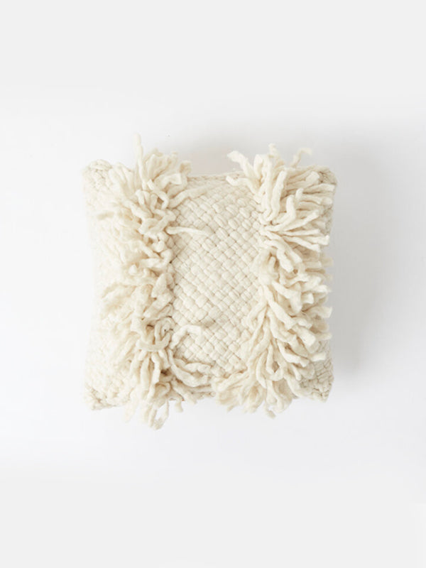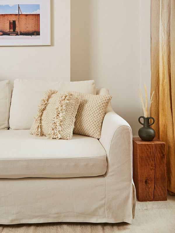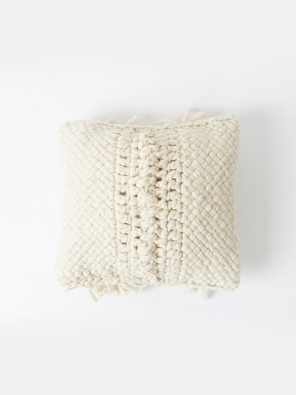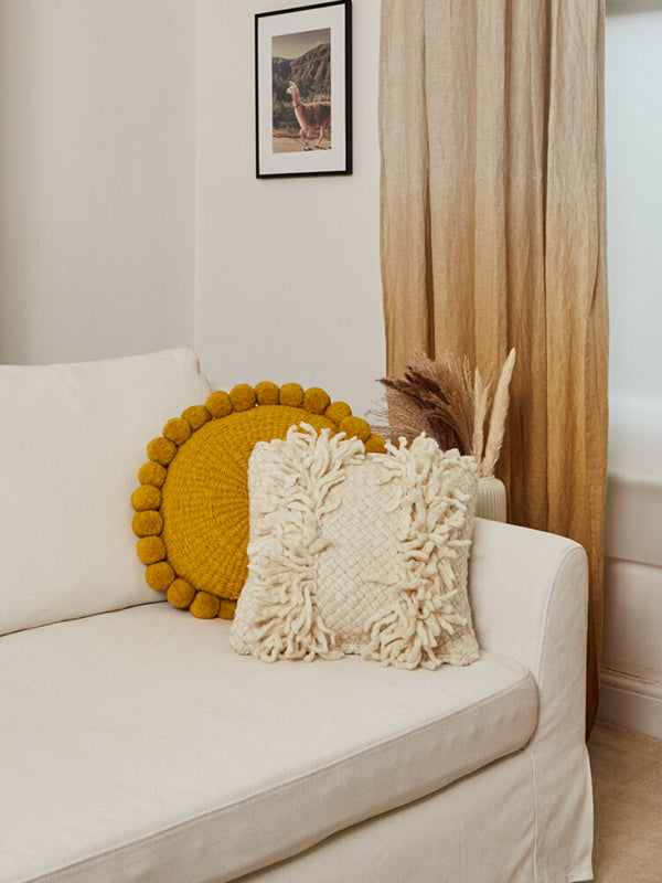 The Puna cushion is handwoven by interlacing yarns in a cross-hatch pattern and complete with two parallel fringes. Its name is inspired by the location where the artisans that make it come from. Made in Argentina using local sheep’s wool, its natural cream colour will fit seamlessly into most interiors.