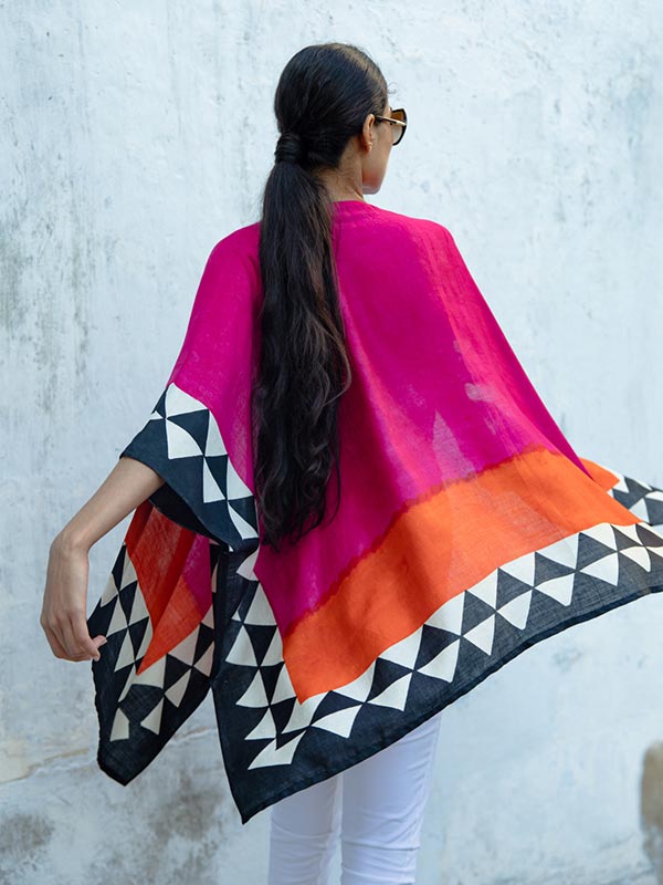 The Pyramid Silk Short Kimono in fuchsia, orange and black features a wide cut body, front open, drop shoulder with oversized sleeves for a relaxed silhouette.