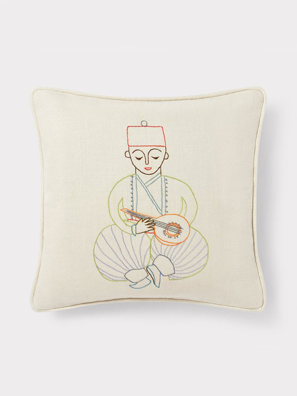 Featuring a colourful hand stitched man playing his Oud, this hand embroidered cushion is a celebration of traditional Syrian crafts and culture. Each cushion is hand sewn by Syrian women living in Lebanon - all profits are returned to the women to help them rebuild their lives. The Oud Player can be a soloist, or paired with more handcrafted cushions for a beautiful harmony.