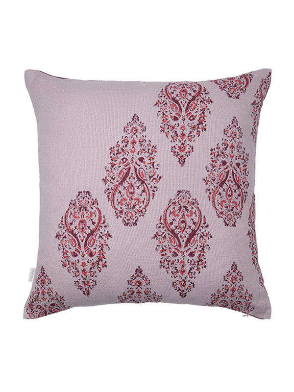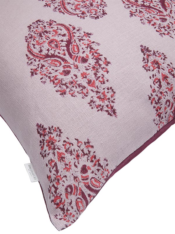 Bold colours and mesmerising prints make this linen cushion a true statement piece. Hand block printed by artisans in India at Tharangini Studios, the cushion cover has a geranium and pink embellishment set on a keepsake lilac base and contrasted against deep plum backing. Made using 100% organic linen, each lilac cushion has a concealed zip and comes complete with a 100% British sheep's wool filler.