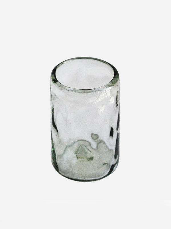 Made from recycled glass, the tall glasses are handblown in Tonalá, Jalisco, using traditional methods. The tumblers have a clear organic shape with thick glass and pinch detailing for the perfect hold. A versatile shape suited to every kind of drink.
