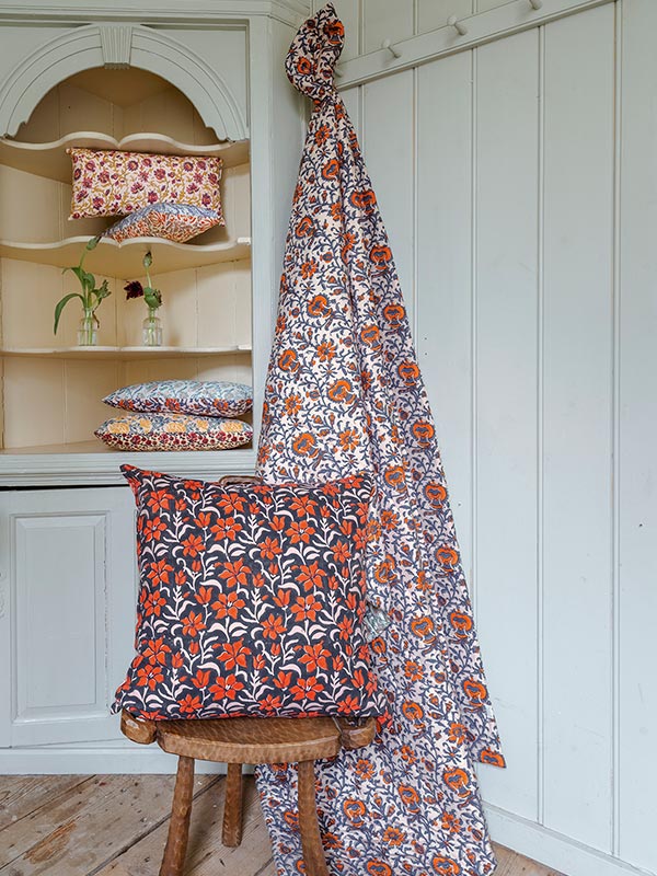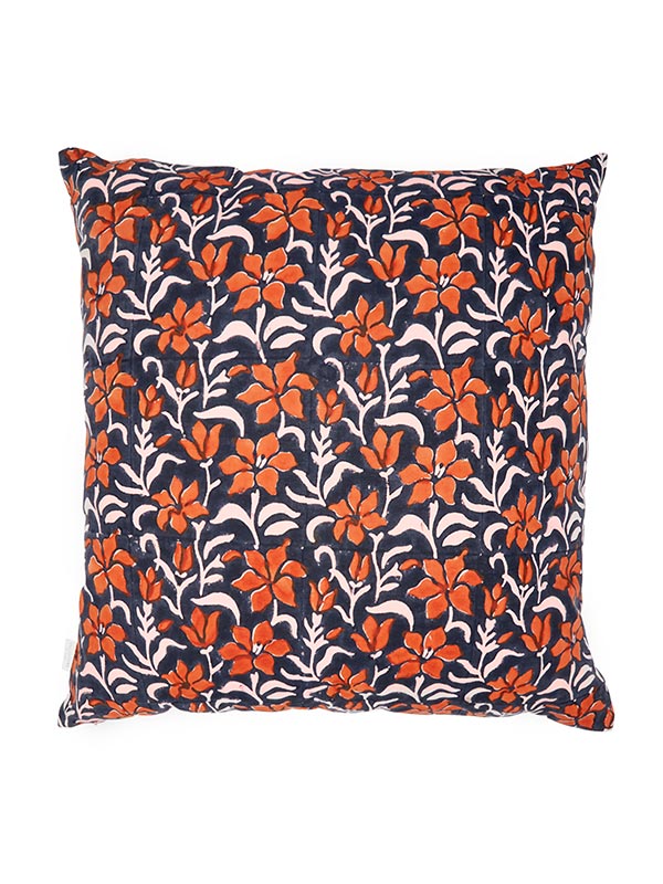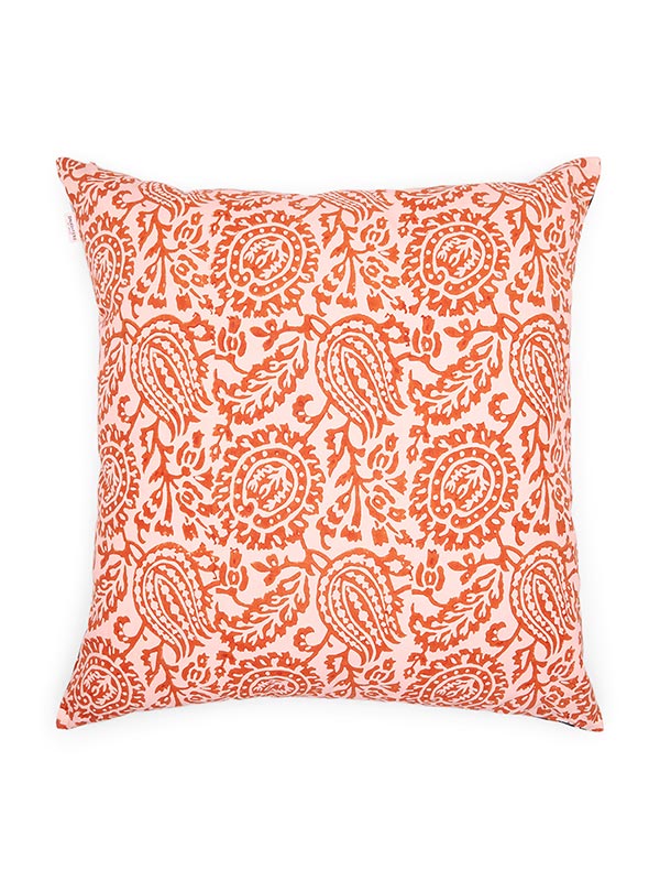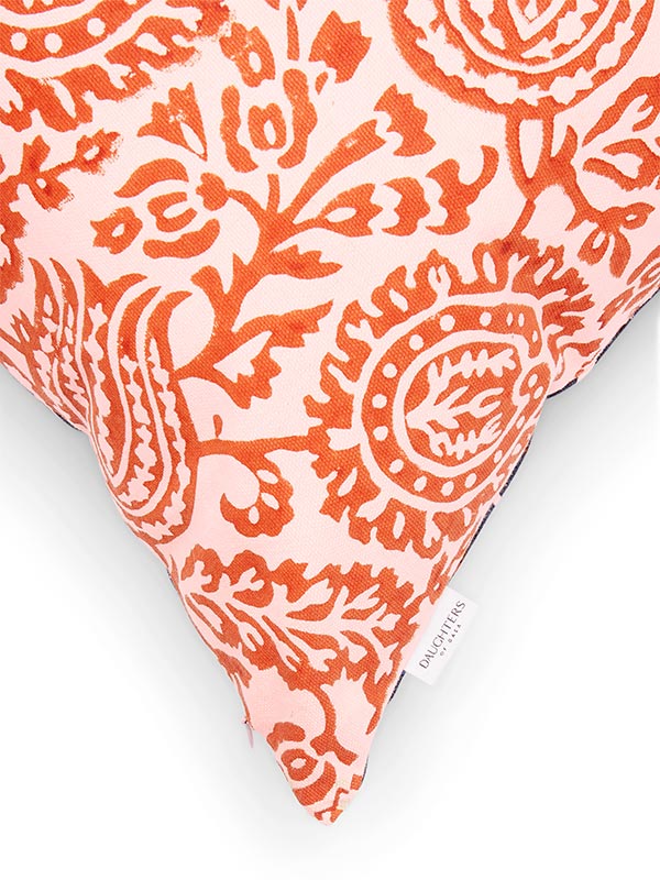 Invite a luxe feel and traditional charm with Daughter of Gaea's Sahana extra-large reversible cushions. Featuring an exclusive bold, hand block design, the floral cushion has a pink salt base with orange, red and navy detailing. Printed on a dyed organic cotton canvas by artisans in India’s Tharangini Studio.