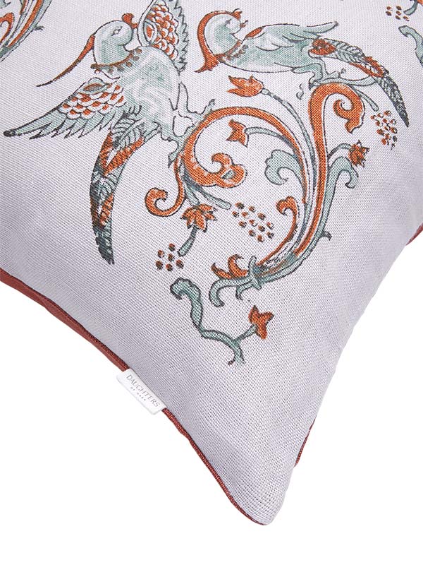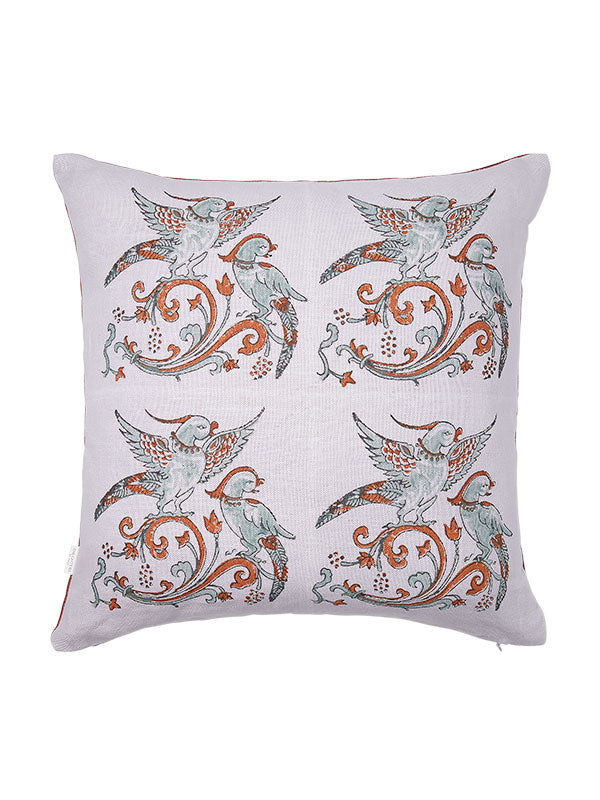 The Saira linen cushion is a fusion of traditional Indian hand block prints with contemporary modern hues. Crafted in Tharangini Studios in India, the lavender blue cushion is printed with deep orange ochre and stonewash blue birds and has a contrasting deep red back. The linen cushion covers are made from 100% organic linen which is made to last, and come complete with a 100% British wool filler.