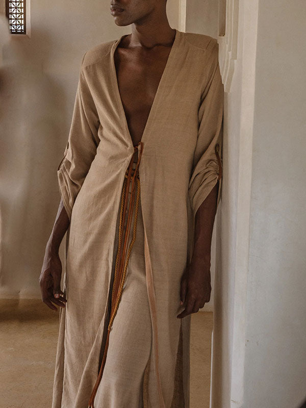 With a strong, structured shoulder and long attached waist belt, this style can be styled in many different ways. Open front with side slits for a breezy feel.