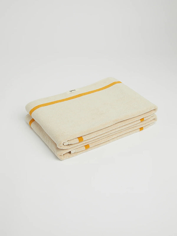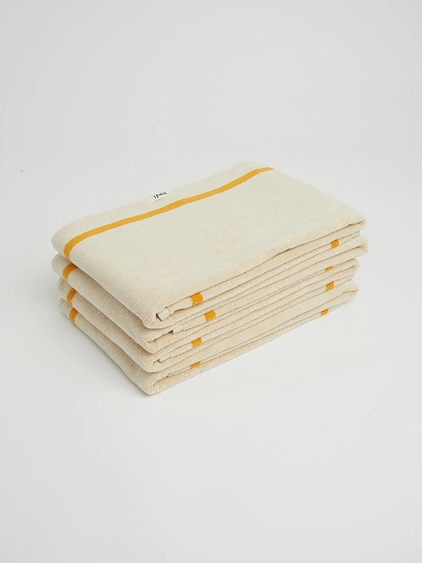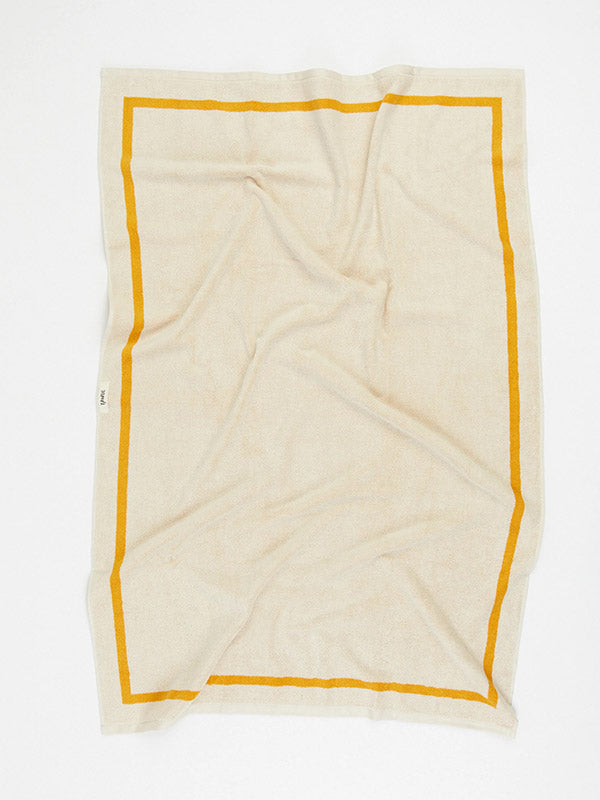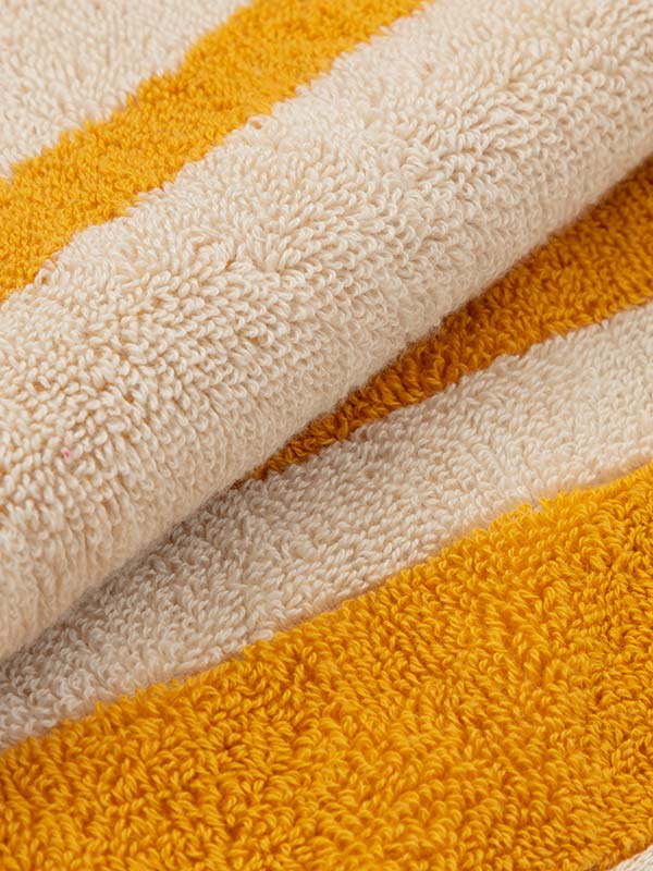 Large yellow organic cotton towel with a vintage match box design. The design is inspired by the Bilberry bumblebee - or ‘jewel of the Lake District’ - an endangered species with distinct mustard yellow thorax bands and deep orange and red tail. The block yellow towels are super soft to touch, made from 100% GOTS certified organic cotton with a medium sized loop pile to ensure durability and maximum absorbency.