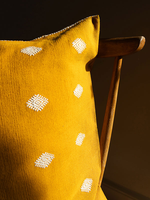 This cushion has been handwoven for over 55 hours using a traditional and intricate hand brocade technique. This zero waste design, which is deeply rooted in mayan culture, transcends their spiritual belief that each point of a diamond represents the path of the sun each day. Quality in every stitch, style for every season.