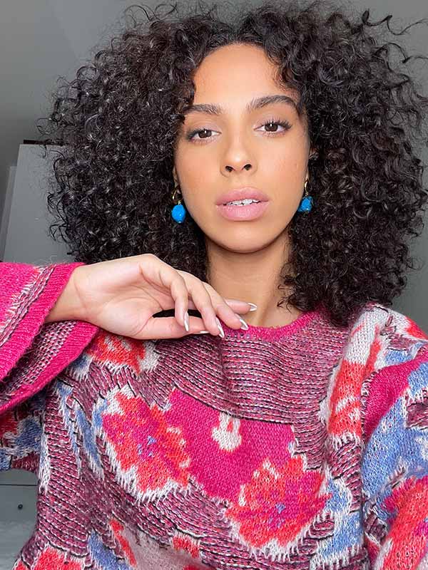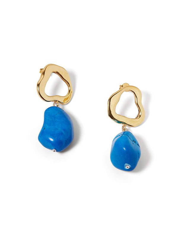 Organic brass earring with freshwater pearl and semi-precious blue agate detail.