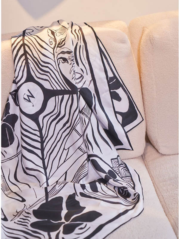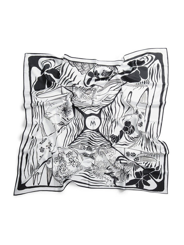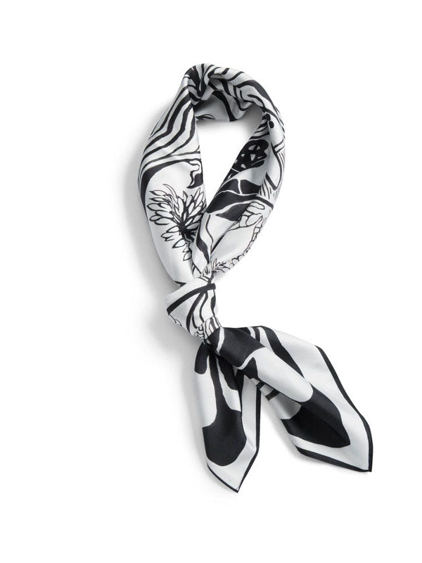 A black and white silk scarf made as a tribute to the traditional Japanese patterns called Wagara that date back to the 8th century Heian period. Inspired by nature, the patterns were created to decorate garments worn by nobles in different seasons and for different occasions.