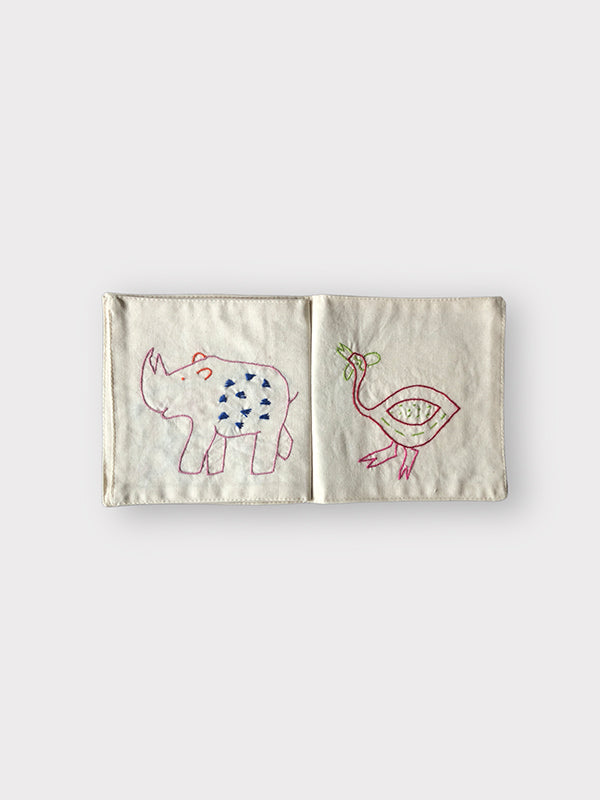Transport your little one's minds to Africa with Penduka's cotton children's book. Made from 100% cotton, the unique kid's book is embroidered with pictures of the wild animals of Namibia, such as the warthog, rhino, giraffe, oryx gazelle, porcupine, and bustard bird. Beautifully embroidered and hand-made by Penduka artists from the slums of Katutura district, Windhoek. Each children's book contains a label with the artist's name who embroidered the book.