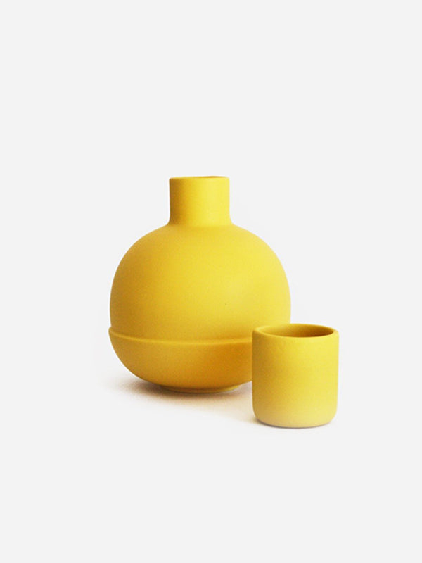 This unique and contemporary water carafe draws upon the traditional water pitchers found in Tonalá and Tlaquepaque, Jalisco. Wheel thrown by a master artisan in Tonalá, the ceramic carafe has a spherical body and short neck, and comes complete with two cups for drinking. The pitcher is finished in a yellow glaze, both inside and out. Rich in narrative and history, it makes a beautiful addition to any modern kitchen.